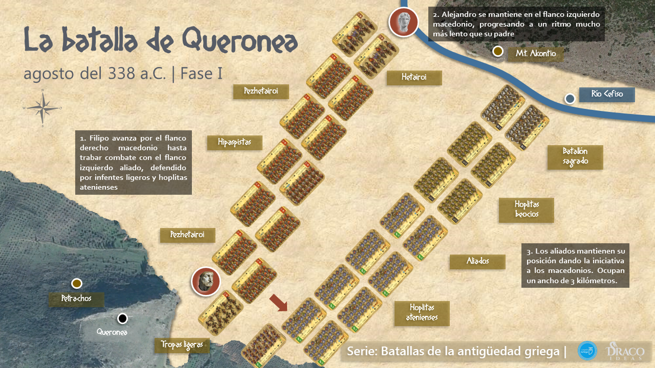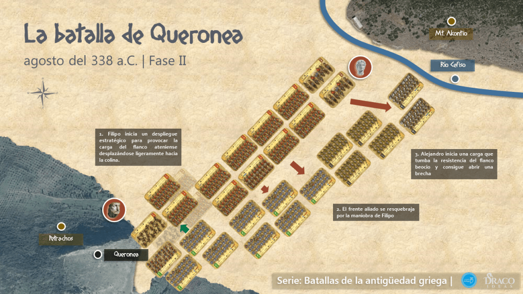 Según la interpretación tradicional, los macedonios avanzaron de forma que Filipo se aproximó a los atenienses mientras Alejandro seguía estando a una considerable distancia del flanco derecho aliado. Polieno da cuenta de dos datos interesantes. Por un lado, que el rey macedonio buscaba sacar partido de la mayor experiencia y el mejor entrenamiento de sus tropas alargando la batalla (Estratagemas, IV, 2, 7). Por otro, que poco después de trabar combate, inició un lento, pero ordenado, repliegue estratégico con el que trataba de descolocar las líneas enemigas. En efecto, los atenienses se lanzaron contra las tropas de Filipo de forma desordenada y cuando el rey dio la señal, los macedonios cargaron contra los desconcertados enemigos abriendo una importante brecha (Estratagemas, IV, 2, 2). El astuto movimiento de Filipo, que ha sido sometido también a un intenso debate académico (Caukwell, 1978: 148), tenía otro propósito, estirar el frente aliado para generar un resquicio por el que realizar una letal carga de caballería (Hammond, 1994: 154). En efecto, este fue el momento aprovechado para que los escuadrones macedonios, con su característica disposición en cuña, asestaran un golpe definitivo por el flanco izquierdo. Por el testimonio de Plutarco se ha pensado que Alejandro comandaba esta carga (Alejandro, 9, 3), pero lo cierto es que pudo ser otro general más experimentado en estas lides, ya que el momento era sumamente delicado. Diodoro explica que los mejores generales arropaban a Alejandro (XVI, 86, 1), pero su relato no permite deducir si la caballería estaba comandada o no por el futuro rey.