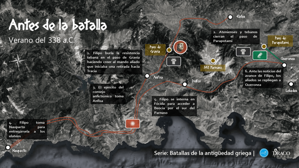 En el verano del año 338 a.C. Filipo decidió pasar a la acción. Dirigió sus tropas contra Anfisa a través del paso de Gravia. Cuenta Polieno que hizo creer a los defensores del enclave que retiraba su destacamento en Cytinium para emprender el regreso a Macedonia con el objeto de resolver algunos problemas en la frontera con Tracia. Envió a un mensajero como señuelo con un falso mensaje para Antípatro en el que informaba del supuesto movimiento. Lo hizo de tal manera que facilitó su captura por los defensores (2). Próxeno y Cares relajaron sus tareas de vigilancia, momento que el rey aprovechó para asaltar el paso (Estratagemas, IV, 2, 7-8). Acto seguido, se dirigió hacia Anfisa, tomó la ciudad y se encaminó hacia Naupacto, que conquistó para entregársela a las etolios como gesto por su apoyo durante la campaña. Desde allí, Filipo se dirigió hacia Delfos, para penetrar en Beocia hasta llegar a la llanura de Queronea, donde se encontraba la vanguardia del ejército aliado, que había abandonado el paso de Parapotami ante las noticias que llegaban del avance macedonio (Hammond, 1994: 148 y Monedero, 2014: 41).