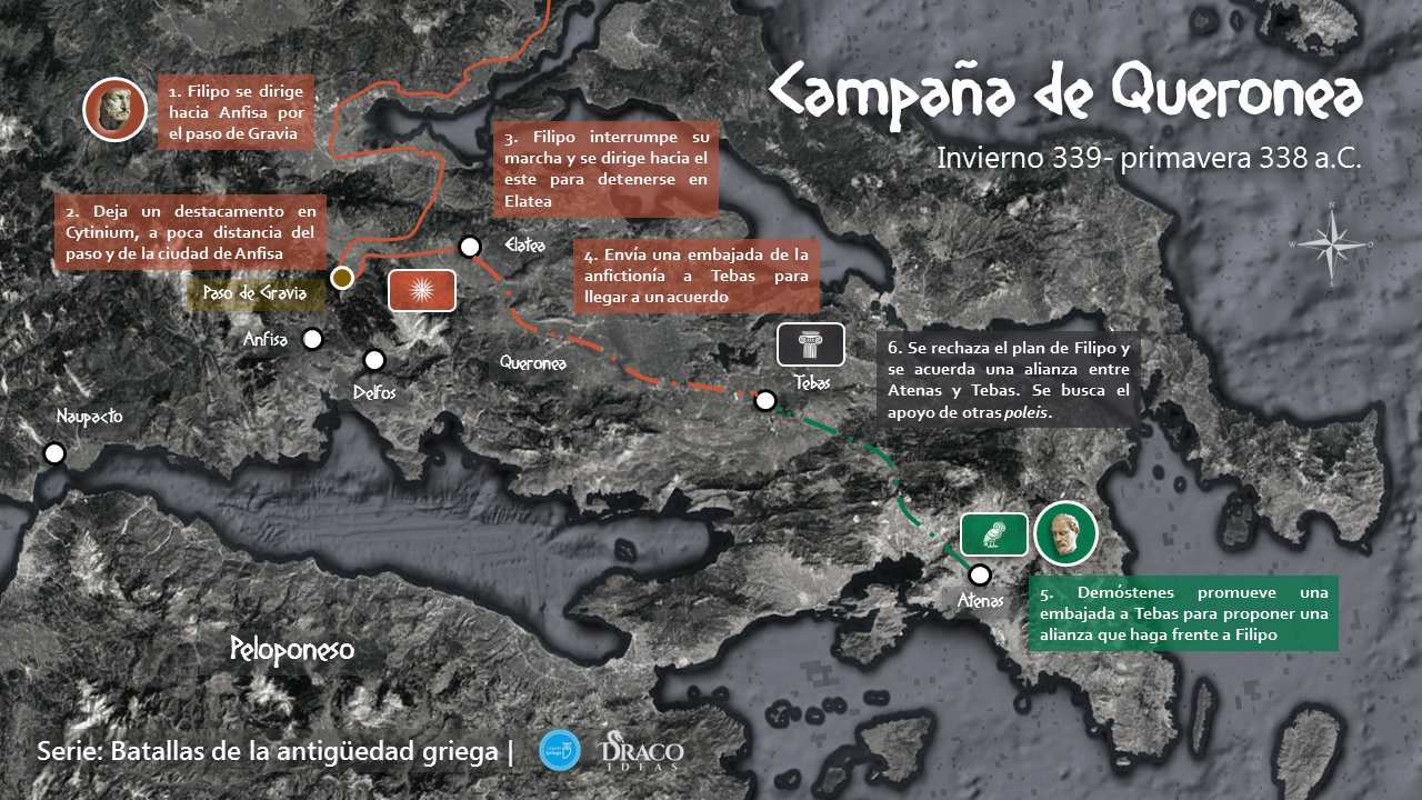 La diplomacia, sin embargo, no funcionó. No queda claro si fueron los tebanos los que pidieron ayuda a Atenas, tesis defendida por Esquines (Contra Ctesifonte, 140) o fueron los atenienses quienes, movidos por el ardor oratorio de Demóstenes, consiguieron cambiar el parecer de sus antiguos y enconados enemigos para aliarse con ellos, tal y como el propio político reconoce en un largo pasaje de uno de sus aclamados discursos (Sobre la corona, 188-211). Siglos más tarde, Diodoro de Sicilia afirma que los desesperados ciudadanos de la polis volvieron sus ojos hacia Demóstenes (XVI, 84, 3-5), hecho que también pone de manifiesto el beocio Plutarco (Demóstenes, 17, 5). Sea como fuere, Lo evidente es que los antiguos rivales se unieron ante la amenaza común (Anson, 2020: 68) y rechazaron la oferta de Filipo hasta dos veces (Hammond, 1994: 146). Para el rey macedonio la embajada había cumplido su propósito de cara a la opinión pública griega: pretendía que su expedición no fuera vista como la prolongación de la guerra contra Atenas, sino como una misión de la Anfictionía.