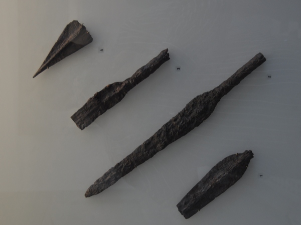 El testimonio de Plutarco y los hallazgos arqueológicos permiten confirmar que estamos ante el túmulo macedonio. Las sarisas eran el arma fundamental de los pezhetairoi, los célebres falangitas. La dóry podría pertenecer a un hipaspista, infantería de élite que vestía una indumentaria parecida a la de los hoplitas, mientras que la kopís era habitualmente empleada por la caballería (sobre armamento macedonio: Connolly, 2016: 83-89; Quesada Sanz, 2008: 135-154; Minor Markle III, 1977: 323-329 y Heckel-Jones, 2009: 18-24). Las puntas correspondientes a armas ligeras, jabalinas y flechas, serían el testimonio de la participación de infantería ligera y arqueros (MA, 2008: 75; Pascual, 2020: 67-69). Pero no todo es tan fácilmente deducible. Algunas de estas armas, como la punta de la dóry o las puntas de flecha, podrían estar alojadas en el cuerpo de los caídos, de manera que no pertenecerían al bando macedonio, sino a sus enemigos (MA, 2008: 75).