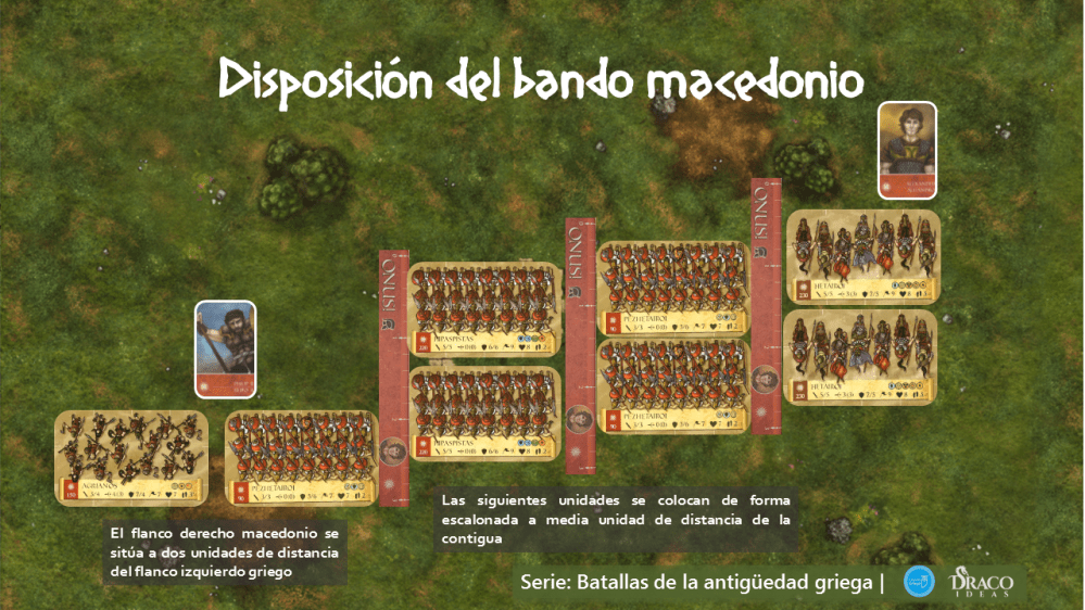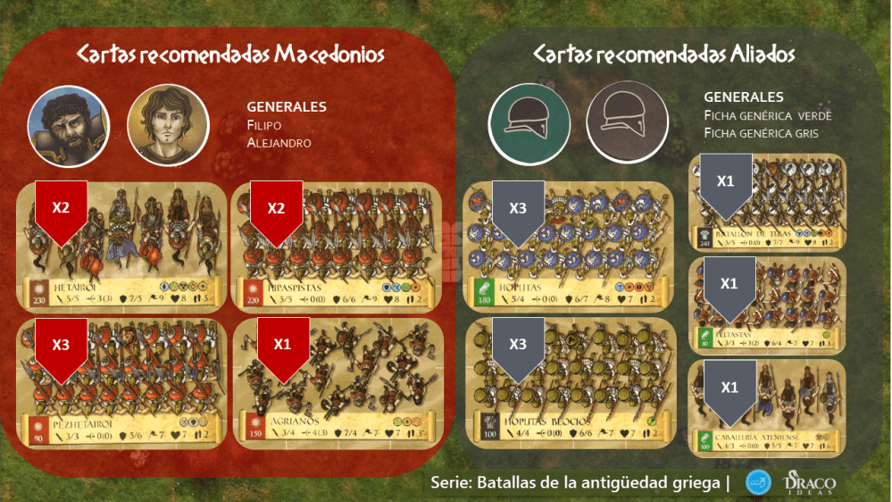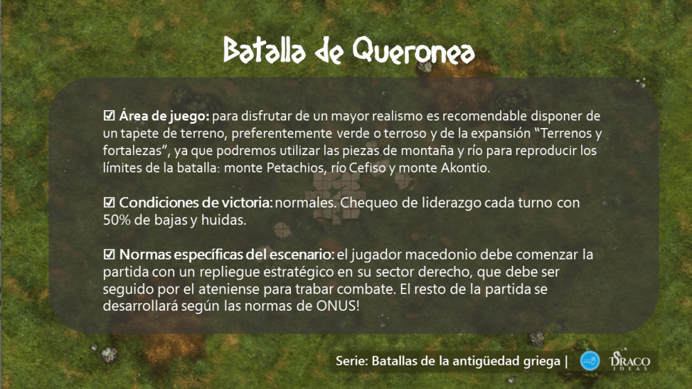Para recrear la batalla de Queronea necesitaremos el pack «Roma & Cartago», que incluye marcadores y cartas de eventos, la expansión «Griegos y persas» con la ampliación de Macedonia y, si queremos incluir elementos de paisaje como el río Cefiso, la extensión «Terrenos y fortalezas».