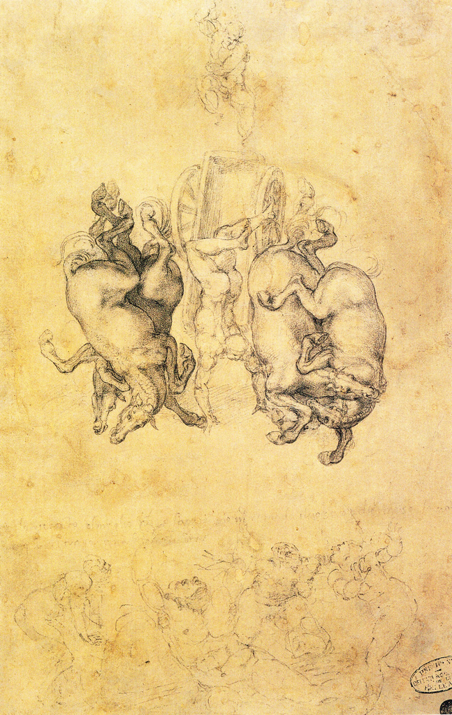 La caída de Faetón es el último de los dibujos obsequiados por el florentino. Conservamos hasta cuatro versiones que podrían atribuirse con diferentes grados de certidumbre a Miguel Ángel. En todas ellas la composición es semejante: Zeus se yergue sobre el águila para lanzar el rayo sobre el audaz hijo de Helios, cuya soberbia le había llevado a querer conducir el carro de su padre. Se trata de otro mito conocido, evocado de forma magistral por Ovidio al comienzo del segundo Iibro de su Metamorfosis, en uno de sus más largos poemas: abarca desde la peripecia del malogrado joven hasta el duelo de sus hermanas, las Helíades, convertidas en árboles por su llanto inconsolable, y la transformación de Cicno, unido por una estrecha amistad a Faetón, en un esbelto cisne (II, 1-400). Forcellino ha interpretado la elección de este tema como metáfora de la presunción del artista por acercarse a un joven de la belleza y reputación social de Tommaso (2018: 304), aunque también se ha visto en la caída del hijo de Helios una alegoría del tormento que sufría Miguel Ángel ante sus impulsos homosexuales (Zöllner y Thoenes, 2019: 387).