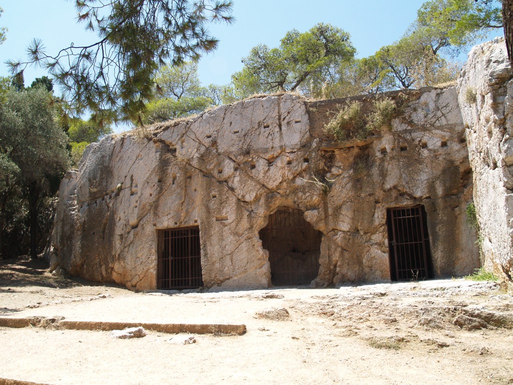En el cruce de las calles del Apóstol Pablo y San Dionisio Areopagita (Dionysiou Areopagitou) arranca un camino empedrado que nos adentra en la boscosa colina de las Musas, llamada así por el monumento funerario que la corona hoy en día. A pocos metros de iniciar nuestra marcha, antes de llegar a la iglesia de Agios Demetrios Loumpardiaris, una senda nos conduce a un enclave que la tradición popular bautizó como la Prisión de Sócrates. Durante siglos se creyó que allí había estado preso el afamado filósofo, aunque la mayoría de investigadores, con cierta razón, aseguran que Sócrates debió de quedar confinado en la Heliea, donde fue juzgado, o en sus proximidades, en la prisión estatal aneja, es decir, en el recinto del Ágora. Las cuevas que hoy vemos debieron de ser, simplemente, unas viviendas trogloditas aprovechadas siglo tras siglo hasta quedar en el estado en el que podemos contemplarlas en la actualidad. Pero podemos detenernos unos minutos bajo la sombra de los árboles que pueblan este lugar para profundizar en uno de los episodios más controvertidos de la historia de la ciudad: el juicio de Sócrates.